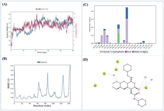 Post-simulation analyses were conducted using Schrödinger and included root-mean-square deviation (RMSD) to assess the stability of the protein backbone and ligand, using the initial structure as the reference. Root-mean-square fluctuation (RMSF) was calculated for protein Cα atoms to identify flexible regions within the protein. Protein–ligand contact analyses identified and quantified key stabilizing interactions, including hydrogen bonds, hydrophobic contacts, and salt bridges, using distance and angle cutoffs. The percentage of simulation time these interactions were maintained was also calculated to evaluate their stability throughout the simulation.