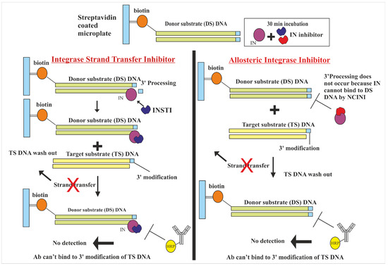 3′-Processing (3′P) inhibition assay was performed using the HIV-1 Integrase Assay Kit (XpressBio, Frederick, MD, USA) with minor modifications. Initially, 96-well plates were coated with 100 µL of donor substrate DNA corresponding to the HIV-1 LTR region and incubated overnight at 4 °C. After incubation, the wells were washed three times with PBS to remove unbound DNA, followed by blocking with 200 µL of PBS containing 5% BSA for 1 h at room temperature. This step ensured the elimination of nonspecific binding.