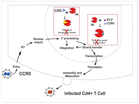 Schematic representation of HIV infection with inhibitory effects demonstrated by the proposed lead compounds against stages of IN (strand transfer and 3′ processing). Abbreviations: C295 is Zinc C295, ELV is Elvitegravir.