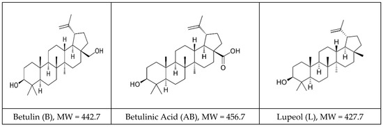 Pentacyclic triterpenoids are an important family of bioactive phytochemicals and are classified in different classes, lupane-type (lupeol, betulin, and betulinic acid), oleanane-type (oleanolic acid, ß-amyrin, and erythrodiol), and ursane-type (ursolic acid, α-amyrin, and uvaol). The lupane family is the most known, with betulin, betulinic acid, and lupeol showing diverse therapeutic effects. The outer bark of Betula Pendula Roth (birch tree) contains betulin (B) as a major component along with betulinic acid (AB) and lupeol (L), as shown in Figure 1.