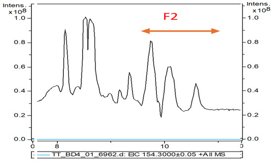 The same TT extract was characterized by a UHPLC-QTOF-ESI+-MS analysis. Figure 2 shows the LC chromatograms of the initial raw bark extracted in acetonitril (Figure 2) and fraction F2 collected between 9.5–11 min, representing the TT extract to be used in further experiments (Figure 2).