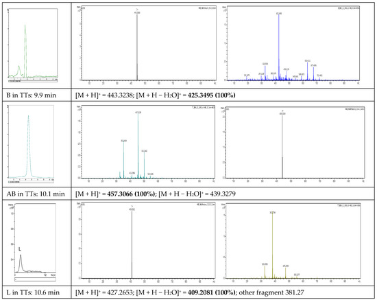 This analysis was performed on a Bruker Daltonics MaXis Impact (Bruker GmbH, Bremen, Germany) device including a Thermo Scientific HPLC UltiMate 3000 system with a Dionex Ultimate quaternary pump delivery and ESI+-QTOF-MS detection, on C18 reverse-phase column (Kinetex, UPLC C18) (5 µm, 4.6 × 150 mm) at 25 °C, a flow rate of 0.8 mL/min, and an injection volume of 25 µL. The mobile phase was represented by a gradient of an eluent A (pure water containing 0.1% formic acid) and eluent B (Methanol:Acetonitrile:Isopropanol, 1:1:1, containing 0.1% formic acid). The gradient system consisted of 70% A (min 0), 30% A (min 4), 0% A (min 7), 30% A (min 10), and 70% A (min 13), followed by 2 min isocratic elution with 70% A. The total running time was 15 min. The MS parameters were set for a mass range between 100–1000 Da. The nebulizing gas pressure was set at 2.8 bar, the drying gas flow at 12 L/min, and the drying gas temperature at 300 °C. During each chromatographic run, a calibration with sodium formate was carried out. The control of the instrument and data processing used the specific software provided by Bruker Daltonics, namely, Chromeleon, TofControl 3.2, Hystar 3.2, and Data Analysis 4.2. The identification of each component was carried out by Data Analysys, considering the MS spectral analysis for each component and specific fragmentation. The Extract Ion Chromatogram was also used to confirm the specific fragments for B, AB, and L in the TT extract.