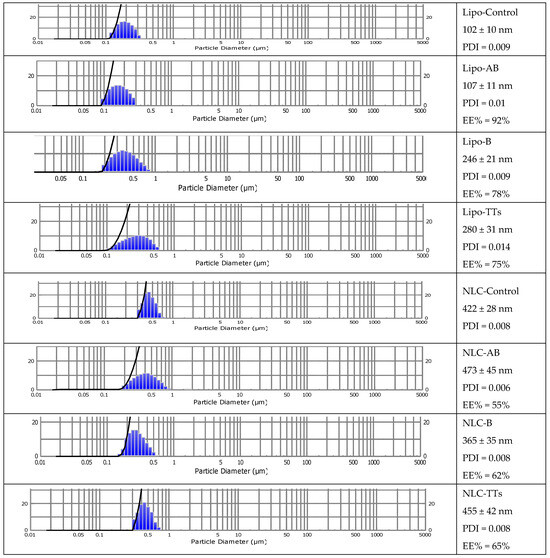 Mean sizes of Lipo- and NLC-nanoformulations containing entrapped AB, B, and TTs comparative to controls, as determined by DLS. Size distribution diameters (mean ± SD) (nm) of the formulations, and the PDI value and the encapsulation efficiency (EE%) are included.