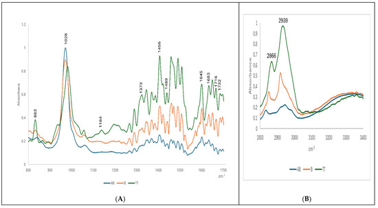 The ATR-FTIR superposed fingerprints of AB and B compared to TT extract, after evaporation on the diamond cell: (A) the spectra were recorded in region 850–1750 cm−1 and in the region 2800–3400 cm−1 (B).