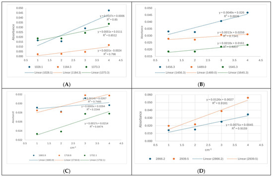 The highest values of R2 and the correlation between concentration/absorbance were identified at 2866.2 and 2939.5 cm−1 for B standards. The same correlation was obtained from the TT extract using four dilutions (dilution nr 4 representing the stock solution diluted 2.5 times in EtOH:DMSO), as shown in Figure 6. All dilutions were made in the same solvent mix and the highest R2 values (above 0.91) were found at 2939.5 and 2866.2 cm−1 (Figure 6D).