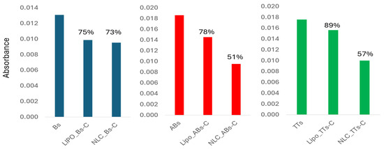 The EE% values shown in the first columns (blue) were similar in the Lipo- and NLC-formulations, and were around 74% compared to the initial concentration of Bs. The EE% values shown in the red columns were 78% in Lipo-ABs-C compared to 51% for NLC-ABs-C. For TTs, the EE% values were 89% vs. 57% in the Lipo- versus NLC-formulations, and for B in solution (Bs) compared to B entrapped in Lipo- and NLC-formulations. As a conclusion, Lipo-formulations showed similar EE% values for all terpenoids while NLC-formulations showed inferior values, especially for ABs and TTs.