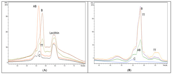 Figure 8 includes the superposed HPLC-DAD chromatograms (recorded at 212 nm) of the Lipo-nanoformulations by the solubilization of the retentate after the entrapment of AB, B, and TT in Liposomes, compared to empty Liposomes (Figure 8A) and solubilized NLC retentates after the entrapment of AB, B, and TT in NLC, compared to empty NLC (Figure 8B).
