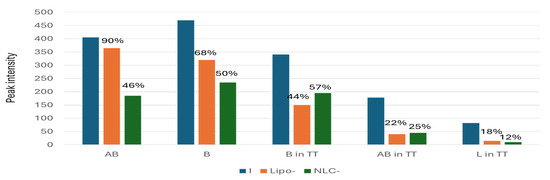 The HPLC-DAD fingerprints of the Lipo-formulations show the presence of lecithin (Rt = 6.3–6.5 min), the main component of Liposomes, a shift of Rt values, with Lipo-AB having AB-Rt = 5.5 min, B-Rt = 5.8, and TT presenting a main peak similar to B (Rt = 5.8 min), a second one, as a shoulder, attributed to AB (Rt = 5.5 min), and a minor peak at Rt = 6 min attributed to L. The fingerprints of NLC-formulations were different: the Rt values for B and TT were similar and superposed, at Rt = 5.8 min; for AB, at 5.7–5.9 min; and TT had a more pronounced shoulder at 6–6.2 min. The large peak between 6.4–6.7 min corresponded to other lipid constituents of NLC after entrapment (presumably oxidized lipid derivatives), while the control NLC had only a small peak at 5.5 min.