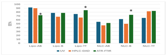 Comparative evaluations of EE%, as mean values, calculated according to the entrapment of AB, B, and TT in Lipo- and NLC-formulations. The mean values of EE% were obtained independently by the three methods: UV spectrometry, ATR-FTIR, and HPLC-DAD. * p < 0.01.