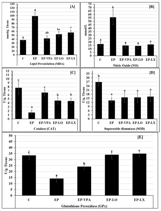 Changes in prooxidant markers in hippocampal homogenate tissues: panel (A) lipid peroxidation and (B) nitric oxide; (C) catalase, (D) superoxide dismutase, and (E) glutathione peroxidase of different groups: control (C), epileptic (EP), valproic acid-treated (EP-VPA), L. dentata oil-treated (EP-LO), and L. dentata extract-treated (EP-LX). The data were analyzed using the Tukey–Kramer method for post hoc analysis to compare various groups with each other. Subset for alpha = 0.05 and the means for groups in homogeneous subsets are displayed. All values are represented as Mean ± Std and n = 8 animals/group. Means within the same parameter and not sharing a common superscript symbol(s) differ significantly at p < 0.05.