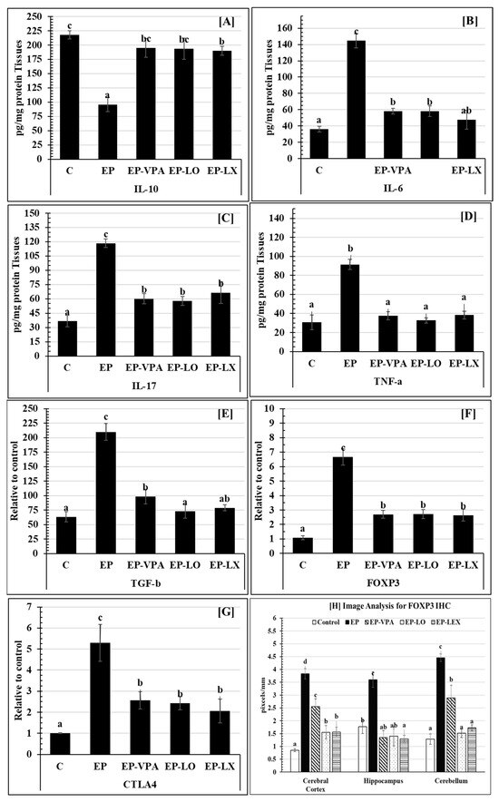 Changes in prooxidant markers in hippocampal homogenate tissues: panel (A) IL-10; (B) IL-6; (C) IL-17, (D) TNF-a; (E) TGF-b; (F) FOXP3 expression; (G) CTLA-4 expression; and (H) IHC quantification image analysis for the stained FOXP+ cells in different regions of hippocampal sections of different groups: control (C), epileptic (EP), valproic acid-treated (EP-VPA), L. dentata oil-treated (EP-LO) and L. dentata extract-treated (EP-LX). The data were analyzed using the Tukey–Kramer method for post hoc analysis to compare various groups with each other. Subset for alpha = 0.05 and the means for groups in homogeneous subsets are displayed. All values are represented as Mean ± Std and n = 8 animals/group. Means within the same parameter and not sharing a common superscript symbol(s) differ significantly at p < 0.05.