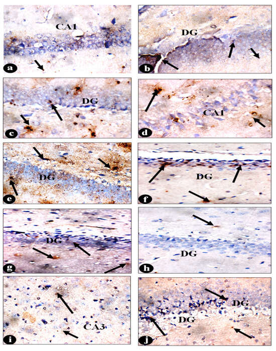 Immunohistochemistry photographs (Formalin/PFA-fixed paraffin-embedded sections) of rat brain tissue staining anti-FOXP3 using antibody CAT # ab75763 with final conc: 1/100, DAB staining (in brown) and hematoxylin QS as a counterstain (in blue). Photographs with black arrows showed positive FOXP3-bearing cells in brain tissues from different groups with positive cells for FOXP3 (arrow, ×400); (a,b) control; (c,d) epileptic DG’s brain; (e,f) valproic acid-treated (EP-VPA)’s DG; (g,h) DG region of sections from L. dentata oil-treated (EP-LO), and (i,j) sections from L. dentata extract-treated (EP-LX). The arrow indicates positive FOXP3+ cells.