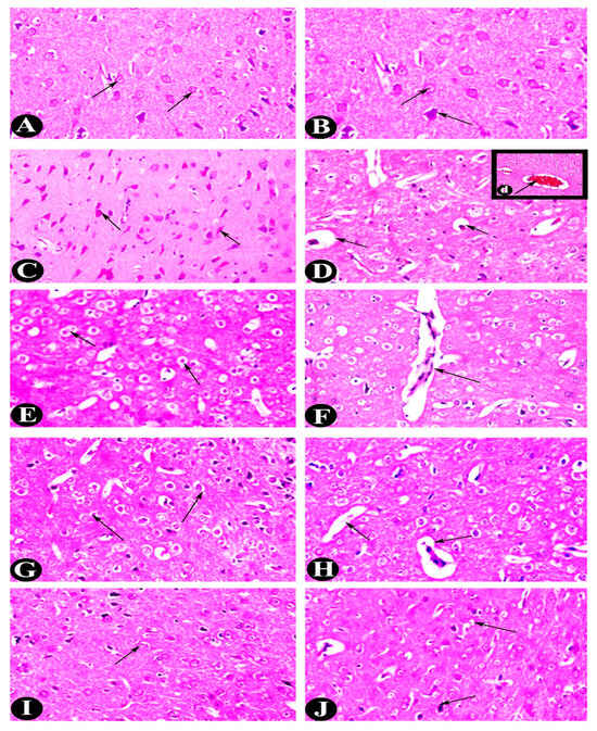 Image analysis quantification for histopathological alterations in the cerebral cortex, which revealed variations in all H&E photographs, was analyzed (six fields/rat/group) using the software ImageJ 1.52e.