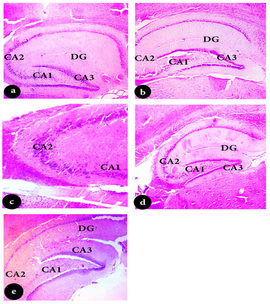 The hippocampus slices from the control animals showed layers of compact granular cells with black nuclei, characteristic of their histological structure. In the molecular layer, glial and pyramidal cells were both observable. Upon high-power examination of the hippocampus region, three layers were typically noticeable: the molecular, pyramidal, and polymorphic layers (Figure 5a). In contrast, the hippocampal portions of the EP group showed atrophy, cellular disarray, and a decrease in the number of large pyramidal cells with darker nuclei. Significant vacuolations were also visible in granular cell layers (Figure 5b). After subjecting the cells to VPA treatment, the size of the pyramidal cells shrank, and their nuclei darkened (Figure 5c; H&E ×400). Additionally, hippocampus slices from EP-LO patients showed no pathological alterations in cellular organization, except for a little reduction in pyramidal cell size and darker nuclei (Figure 5d; H&E ×400). Furthermore, EP-LX therapy demonstrated that the hippocampus retained its typical histological configuration of granular cells with black nuclei and the presence of average glial cells and pyramidal cells in the molecular layer (Figure 5e; H&E ×400).