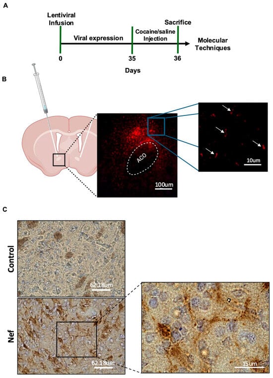 Timeline and schematic representation of bilateral infusions in the NAc at 5 weeks. (A) Specific timeline used for molecular experiments with rats. (B) Schematic representation showing location of the bilateral infusion site on the corresponding coronal section (red dots). Viral expression spans from approximately bregma 0.70 mm to 1.60 mm. GFAP-specific promoter expression of mCherry in NAc of Sprague Dawley rats 5 weeks after infusion; 10× magnification (100 µm scale). Right image shows white arrows pointing at positive punctate cytoplasmic staining in the NAc (right hemisphere); 100× magnification (10 µm scale). (C) Representative images of immunohistochemical staining with Nef antibody (1:50) in NAc slice of Control (top) and Nef-treated (bottom) rat brain tissue. DAB staining in brown with hematoxylin for nuclear counterstain. Pictures of 30 µm thick tissues taken at 60× magnification (62.18 µm scale). Zoomed area at 100× magnification (15 µm scale) of Nef-positive NAc slice demonstrating DAB staining with an astrocyte morphology.