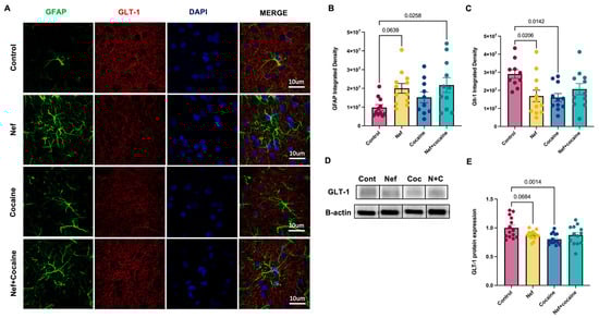 Prior studies have predominantly examined dopamine [], while this study extends to the differences in glutamate transporter expression after re-exposure to cocaine. When astrocytic Nef was present in the NAc of the rats, GLT-1 transporter expression was decreased in intensity (Figure 2C) and expression (Figure 7A). Several preclinical studies have revealed a reduction in GLT-1 expression in the NAc, more precisely in the NAc core, following brief (1 day) and prolonged (40–45 days) periods of cocaine abstinence, along with two to three weeks of extinction, from a typical (2 h per day) cocaine self-administration [,,,].