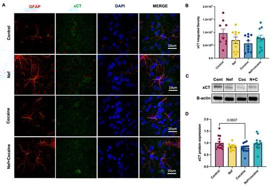 Expression of the cysteine–glutamate exchanger was also considered due to its role in the astrocyte maintenance of glutamate homeostasis. Past studies have demonstrated that this antiporter, also known as xCT, is also downregulated in astrocytes in response to cocaine consumption [,]. Immunofluorescence analysis demonstrated no change in xCT-integrated density after either exposure to cocaine or Nef in the NAc core (Figure 3B). As with GLT-1, no additive effect of cocaine and Nef was observed. Western blot analysis demonstrated only a trend toward a decrease after one dose of cocaine (Figure 3C,D). The data demonstrate that Nef expression in astrocytes in the NAc core does not affect xCT, specifically when measured at 5 weeks post-infusion.