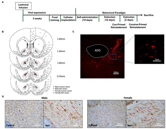 Behavioral timeline and schematic representation of lentiviral infusions in NAc core. (A) Behavioral timeline used for cocaine self-administration experiments with rats. (B) Schematic representation showing placement of the infusion site of each rat in the corresponding coronal section of the NAc ranging from 0.70 mm to 1.60 mm (male control vectors—black dots; male Nef vectors—red dots; female control vectors—red triangles; female Nef vectors—gray triangles). (C) GFAP-specific promoter expression of mCherry in NAc of Sprague Dawley rats 10 weeks after infusion; 10× magnification (100 µm scale) with zoomed-in area at 15 µm scale showing morphology of cells infected. (D) Representative images of Nef immunohistochemistry at infusion site after behavioral paradigm. DAB staining in brown with hematoxylin for nuclear counterstain. Red arrows represent astrocytes positive for Nef. Pictures of 30 µm thick tissues taken at 20× magnification (100 µm scale).
