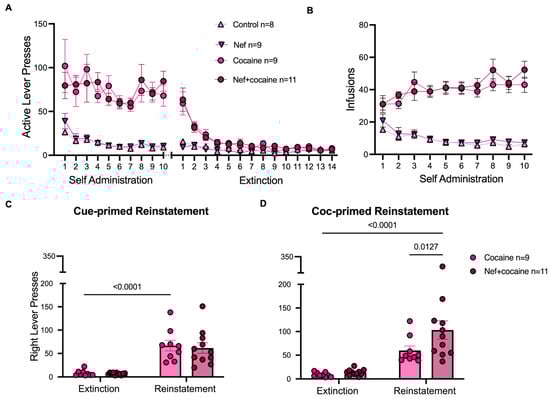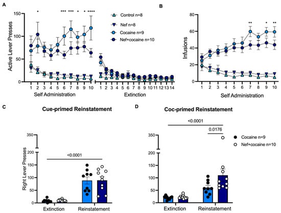 For the behavioral analysis, male and female data were separated because of differences in cocaine consumption. Figure 5 shows male rat behavioral analysis during self-administration, extinction, cue-primed reinstatement, and cocaine-primed reinstatement phases. Male rats expressing Nef had lower active (right) lever presses and, consequently, fewer cocaine infusions during the self-administration sessions than male rats without Nef (Figure 5A,B). During cocaine-primed reinstatement, male rats exposed to Nef significantly increased cocaine seeking compared to the cocaine group (Figure 5D). No differences were observed between cocaine-consuming groups during cue-primed reinstatement (Figure 5C). The data suggest that Nef causes higher cocaine-seeking behavior in male rats, consistent with the reduced cocaine infusions during self-administration; this may be due to higher sensitivity to cocaine when Nef is present in the NAc.