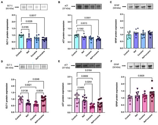 Cocaine exposure can reduce levels of xCT, especially in the NAc of rats after self-administration [,]. The downregulation of xCT supports drug-seeking behavior for cocaine and other addictive substances by causing glutamate spillover in the NAc core []. Additionally, xCT expression is decreased in the NAc core and shell with relapse to cocaine-conditioned place preference (CPP) []. To date, no studies have been conducted to assess the effects of Nef and cocaine on glutamate transporter expression. The current study observed differences in xCT expression between cocaine and Nef-treated male and female rats, where the only effect that occurred was cocaine driven after the behavioral paradigm.