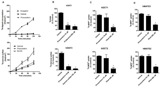 Effect of pinocembrin on the function of P-gp, BCRP, hOAT1, hOAT3, hOCT1, hOCT2, hMATE1, and hMATE2. (A) Transport function of P-gp and BCRP, (B) hOAT1 and hOAT3, (C) hOCT1 and hOCT2, and (D) hMATE1 and hMATE3. Probenecid and estrone sulfate were positive controls for hOAT1 and hOAT3 inhibition. Tetraethylammonium (TPeA) is an inhibitor of hOCT1, hOCT2, hMATE1, and hMATE2. The data are expressed as the mean ± S.D. of % of vehicle control from three experiments. * p < 0.05 compared with the control.