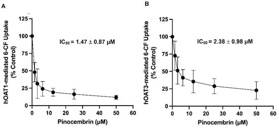 Inhibitory potency of pinocembrin on the transport function of hOAT1 and hOAT3. (A) hOAT1-MDCK cells and (B) hOAT3-MDCK cells incubated with 6-CF (10 µM) in the presence of pinocembrin for 20 min. Uptakes of 6-CF are calculated as % of control (no pinocembrin) and represented as the mean ± S.D. from three experiments.
