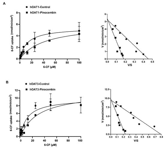 Kinetic studies on hOAT1- and hOAT3-mediated 6-CF uptake. The uptake of 6-CF (1–100 μM) for 20 min in hOAT1-MDCK cells (A) and hOAT3-MDCK cells (B) in the presence of the vehicle and 5 μM pinocembrin. The Michaelis–Menten diagrams and Eadie–Hofstee plots of 6-CF uptake are shown.