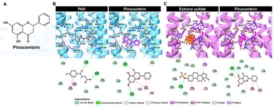 The amino acid sequences of hOAT1 and hOAT3 were obtained from the UniProt database (https://www.uniprot.org/, accessed on 22 October 2023) using UniProtKB Q4U2R8 and Q8TCC7, respectively. In addition, the X-ray structure of human CYP2C19 was downloaded from the RCSB Protein Data Bank (PDB ID: 4GQS). The homological models of hOAT1 and hOAT3 were constructed using the SWISS-MODEL web server [] based on the cryo-EM structure of rat OAT1 bound to para-aminohippuric acid (PAH) as a template (PDB ID: 8SDY []). The protonation states of all ionizable residues were considered at pH 7.4 using the H++ web server []. The SMILES format for PAH, estrone sulfate, and pinocembrin were retrieved from the PubChem database (https://pubchem.ncbi.nlm.nih.gov, accessed on 22 October 2023). The Online SMILES Translator and Structure File Generator (https://cactus.nci.nih.gov/translate, accessed on 22 October 2023) were then used to convert the SMILES strings of each compound into the PDB format. The Gaussian 09 software (Gaussian, Inc., Wallingford, CT, USA) optimized all compounds at the B3LYP/6-31G(d) level. Subsequently, the proteins and ligands were prepared in PDBQT format using AutoDockFR 1.0 [], and docking was performed with AutoDock Vina 1.2.5 []. The dimensions of the grid box were set at 30 × 30 × 30 Å for hOAT1 and hOAT3 and 20 × 20 × 20 Å for human CYP2C19. The grid center coordinates were established as follows: x = 65.06, y = 63.40, and z = 70.68 for hOAT1 and hOAT3; and x = −80.84, y = 22.68, and z = −43.31 for human CYP2C19. The exhaustiveness value was 64, while the remaining parameters were retained at the program’s default settings. The best docked pose of the compounds in the hOAT1, hOAT3, and human CYP2C19 binding sites (i.e., the pose with the lowest Autodock Vina score) was selected for 3D visualization using the UCSF ChimeraX 1.6.1 program []. Meanwhile, the 2D interaction diagrams of the protein–ligand complexes were analyzed using the Discovery Studio Visualizer (BIOVIA, San Diego, CA, USA).
