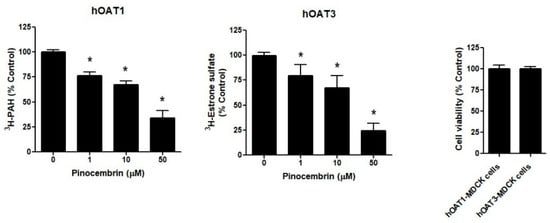 The effect of pinocembrin treatment on hOAT1 and hOAT3. The hOAT1-MDCK and hOAT3-MDCK cells were incubated with pinocembrin for 48 h, followed by the measurement of the hOAT1 and hOAT3 transport function and cell viability. The data are the mean ± S.D. of three experiments. * p < 0.05 compared with control.