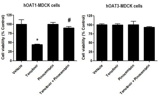 The effect of pinocembrin treatment on hOAT1 and hOAT3. The hOAT1-MDCK and hOAT3-MDCK cells were incubated with indicated conditions for 48 h, then the viability of hOAT1-MDCK and hOAT3-MDCK cells was measured. Data are the mean ± S.D. of three experiments. * p < 0.05 compared with vehicle and # p < 0.05 compared with tenofovir-treated cells.