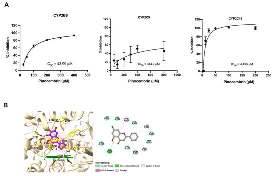 Effects of pinocembrin on the activity of CYP enzymes. (A) Inhibitory effect of pinocembrin on CYP2B6, CYP2C9, and CYP2C19. (B) Molecular docking result of pinocembrin in complex with human CYP2C19 (3D close-up view of active site of CYP2C19 and 2D interaction diagram of pinocembrin–CYP2C19 complex).