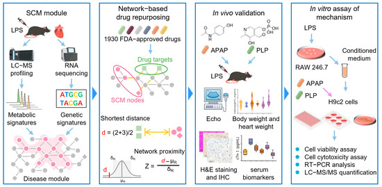In this study, we utilized a systems biology framework that integrated multi-omics and network-based approaches, along with cellular and animal models, to prioritize potential therapeutic agents for SCM from a pool of 1930 drugs approved by the U.S. Food and Drug Administration (FDA). Specifically, we characterized the metabolic and genetic signatures of SCM by analyzing the hearts of lipopolysaccharide (LPS)-induced SCM mice using ultra-performance liquid chromatography–tandem mass spectrometry (UPLC–MS/MS) and RNA sequencing (RNA-seq). We constructed a human metabolite–protein network and found the SCM-associated module within it. We computationally identified some candidates by quantifying the network relationships between each FDA-approved drug and SCM. Network analysis identified 129 drugs associated with SCM, which were refined to 14 drug candidates based on strong network predictions, proven anti-infective effects, suitability for ICU use, and minimal side effects. Finally, we tested the cardioprotective effects of two drug candidates in the SCM mouse model and explored their mechanism-of-action in H9c2 cells (Figure 1).