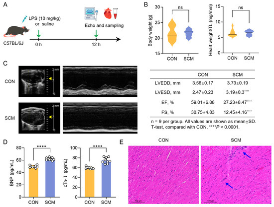Lipopolysaccharide (LPS)-induced septic cardiomyopathy (SCM) in mice. (A) Schematic of SCM mouse model induced by LPS (n = 9). (B) Body weight and heart weight/tibia length ratio (heart weight/TL) in each group. (C) Representative images and data of conventional echocardiography. (D) Serum levels of brain natriuretic peptide (BNP) and cardiac troponin I (cTn-I). (E) Histological examination of mouse hearts with hematoxylin-eosin (H&E) staining (n = 3), blue arrows: inflammatory cell infiltration. Student’s t-test, **** p < 0.0001, ns: no significant difference.