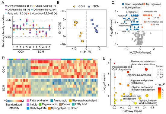 Chromatographic separation was carried out on an XSelect HSS T3 column (2.1 × 100 mm, 2.5 μm; Waters, Milford, MA, USA) at a flow rate of 0.35 mL/min and a temperature of 40 °C. The gradient elution employed a mobile phase consisting of (A) 6.5 mM ammonium acetate in water and (B) methanol. Mass spectrometric detection was performed using an electrospray ionization source, operating in both positive and negative ion modes with multiple-reaction monitoring. There were 6 biological replicates to ensure statistical power, reduce false positives, and increase the reliability of the results. The details are given in the Supplementary Methods.
