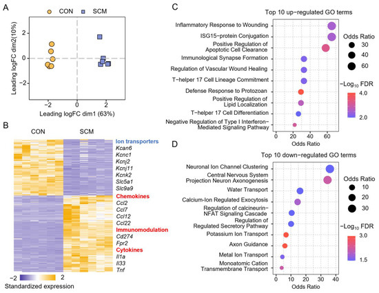 Transcriptomics analysis of septic cardiomyopathy (SCM) mouse heart. (A) Multidimensional scaling (MDS) scatter plot shows genetic differences in mouse hearts between two groups. (B) Standardized expression of differentially expressed genes (DEGs) in the mouse hearts. (C,D) Gene ontology (GO) enrichment analysis of 453 upregulated (C) and 330 downregulated (D) DEGs. The top 10 (highest odds ratio) enriched GO terms of the biological process category are shown.
