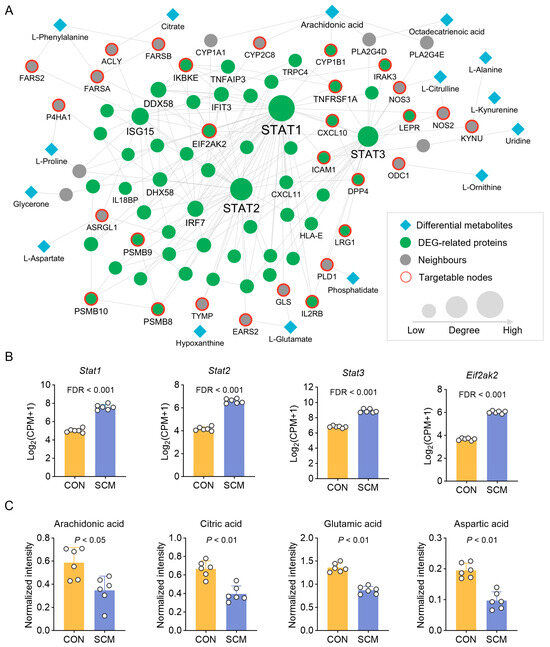 Identification of septic cardiomyopathy (SCM)-associated module. (A) A subnetwork of SCM-associated module in the human protein–protein interactome formed by integrating data from metabolomics and transcriptomics analyses. (B) Gene expression of Stat1, Stat2, Stat3, and Eif2ak2 in transcriptomics analysis. False Discovery Rate (FDR) was calculated using moderated t-statistic with the Benjamani–Hochberg procedure. (C) Expression of representative metabolites arachidonic acid, citric acid, glutamate acid, and aspartic acid in metabolomics analysis. p-value was calculated by using the Mann–Whitney U test.
