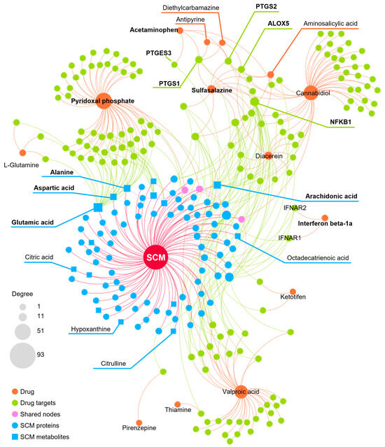 where is the shortest path length between a target () of a drug () and a node () of the CV module (). To evaluate whether such proximity was significant, we performed the permutation test by randomly selecting a group of nodes of the same size and degree distribution as the original drug targets in the network. The network proximity was normalized to Z-score (), where and are the mean and standard deviation of the 1000 random experiments. p-value was also calculated based on the permutation test results. A total of 1930 FDA-approved drugs, as well as their targets, were collected from the DrugBank database (Version 5.1.12). Drugs with z-score < −2.5 and p < 0.01 were considered as candidates for the treatment of SCM. The networks were visualized using Gephi 0.10.1 (https://gephi.org/) accessed on 1 July 2024 or Cytoscape 3.10.2 (https://cytoscape.org/) accessed on 1 July 2024.