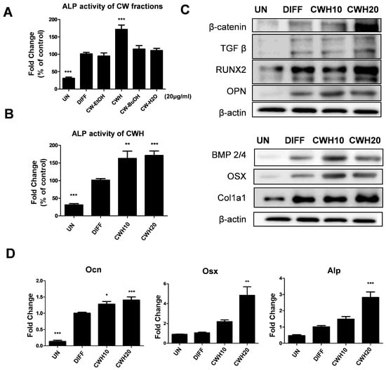 Effects of C. wilsonii (CW) on osteoblastic differentiation in vitro. (A) Comparison of ALP activity between C. wilsonii ethanol extract (CW-EtOH) and its fractions (CWH; n-Hexane fraction, CW-BuOH; buthanol fraction, CW-H2O; water-soluble layers). (B) ALP activity of CWH. (C) Protein expression analysis of osteoblastic markers using Western blot. (D) mRNA expression levels of osteoblastic markers determined by qRT-PCR. Data are presented as mean ± SEM (n = 6). * p < 0.05, ** p < 0.01, and *** p < 0.001 are significantly different from the DIFF group. UN: undifferentiated MC3T3-E1 cell; DIFF: differentiated MC3T3-E1 cell; CWH10 and CWH20: differentiated MC3T3-E1 cells treated with 10 μg/mL and 20 μg/mL CWH, respectively.