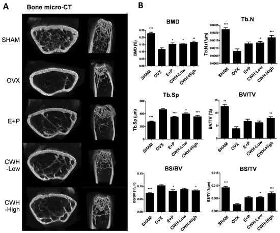 Furthermore, the micro-computed tomography (micro-CT) analysis of distal femur bone architecture showed that CWH administration effectively reversed the reductions in bone density induced by OVX (Figure 3A). Specifically, the quantitative analysis demonstrated that the bone mineral density (BMD), bone surface to tissue volume ratio (BS/TV), and bone volume to tissue volume ratio (BV/TV) significantly decreased, while trabecular separation (Tb.Sp) increased in OVX mice. CWH treatment, however, significantly restored BMD, BS/TV, BV/TV, and normalized Tb.Sp values, indicating a protective effect of CWH on bone health (Figure 3B).