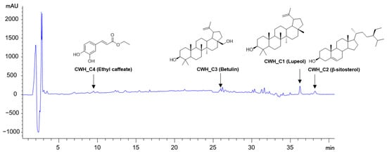 The CWH was analyzed using an HPLC system, and four compounds were identified in their HPLC chromatograms (Figure 5). The contents of four compounds in the concentration (10 mg/mL) of CWH (C4, ethyl caffeate) were 25.5 (C1, Lupeol), 9.7 (C2, β-sitosterol), 3.7 (C3, betulin), and 2.0 μg/10 mg (Figure 5). Furthermore, the structures of each compound were elucidated using NMR analysis, as shown in Supplementary Figure S1 and Table S1.