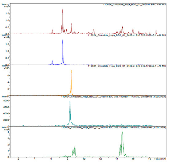 To complete the structural characterization of the alkaloids, the AlkExt was subjected to a UPLC-MS analysis; according to Figure 2, different peaks were observed and analyzed by the extracted ion chromatogram (EIC) tool from the total ion chromatograph (TIC) to confirm the structural characterization of the compounds previously described. For the molecular ion at m/z 328.1600 [M + H]+, a molecular formula of C19H20NO4 (m/z 328.1543) was assigned to two peaks detected in the EIC analysis as isomers (Figure 2), and according to the ms/ms analysis, (S)-scoulerine (Figure 3) was assigned the main peak at rt 7.4 min. The peak at rt 6.1 min should be a scoulerine isomer; unfortunately, the low concentration made it difficult to complete the characterization. The next molecular ions at m/z 342.17 and 356.19 [M + H]+ were assigned to the molecular formulas C20H23NO4 and C21H25NO4 (m/z 342.1699 and 356.1856, respectively) (Figure 2 and Figure 3). According to the ms/ms analysis, two structures were confirmed for these formulas: (S)-tetrahydrocolumbamine and (S)-glaucine. Finally, for the molecular ion at m/z 358.17, at least four peaks were identified from the EIC analysis, and according to the ms/ms analysis, these compounds correspond to the (8S,13aS)-8-(hydroxymethyl)-2,10-dimethoxy-6,8,13,13a-tetrahydro-5H-isoquinolino[2,1-b]isoquinoline-1,11-diol isomers.