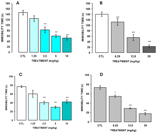 AlkExt at 1.25, 2.5, 5, and 10 mg/kg (A) and clomipramine at 6.25, 12.5, and 25 mg/kg (B) effects in the tail suspension test (TST). AlkExt at 1.25, 2.5, 5, and 10 mg/kg (C) and clomipramine at 6.25, 12.5, and 25 mg/kg (D) effects in the forced swimming test (FST). Bars represent the mean ± standard error of the mean of independent groups of 7 to 9 mice. CTL: administered group with saline solution (0.9% NaCl). Results analysis was performed using one-way analysis of variance (ANOVA) or Kruskal–Wallis one-way analysis of variance on ranks, followed by Holm–Sidak or Mann–Whitney U rank sum test pairwise multiple comparisons. *, p ≤ 0.05, ***, p ≤ 0.001.