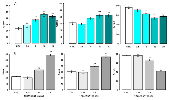 Anxiolytic-like effect of AlkExt at 2.5, 5, 10, and 20 mg/kg (A) and the diazepam at 0.25, 0.5, and 1 mg/kg (B) in the elevated plus maze test (EPM). TOA: percentage of time spent on the open arms; OAE: percentage of time on open arm entries; TCA: time spent on the closed arms expressed as percentage. CTL: control group, (0.9% NaCl solution), bars represent the mean ± standard error of the mean of independent groups of 8 mice. Results analysis was performed using the Kruskal–Wallis one-way analysis of variance on ranks and Tukey’s pairwise multiple comparison test **, p ≤ 0.01, ***, p ≤ 0.001.