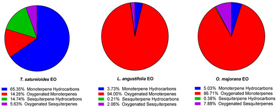 Chemical diversity of sub-classes of terpenes found in the studied essential oils from T. satureioides, L. angustifolia, and O. majorana.