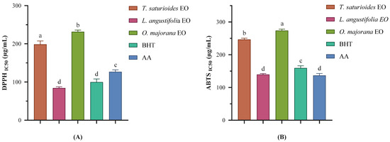 The antioxidant activity of the EOs was assessed using the DPPH assay (A) and the ABTS test (B), with butylated hydroxytoluene (BHT) and ascorbic acid (AA) serving as reference standards. Results are expressed as the mean ± standard deviation (SD) from three independent experiments. Statistically significant differences between groups are denoted by different letters, with significance established at p < 0.05.
