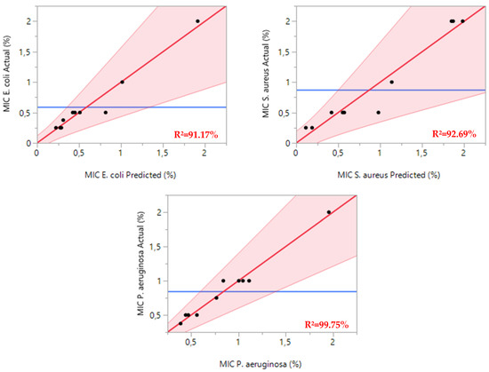 The computed regression coefficients for the special model are shown in Table 5. The associations between all tested parameters and the obtained MIC responses for E. coli, S. aureus, and P. aeruginosa were found using regression models with significant coefficients (p-values < 0.05).
