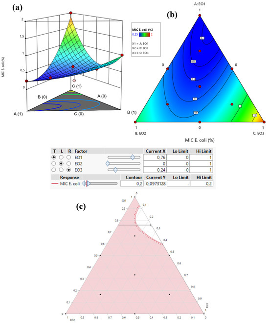 The optimal MIC value for E. coli was determined through an in-depth analysis of 2D and 3D mixture plots, focusing on the identified compromise zone. Panels (a,b) display 3D mixture plots that highlight the desired compromise region, located within the binary mixing zone between T. satureioides and O. majorana. This zone represents the optimal conditions for achieving maximum antibacterial activity. Panel (c) further illustrates this relationship through a 2D mixture plot, pinpointing the specific proportions of the EOs required to reach the desired MIC value of 0.097% against the E. coli strain. The optimal composition was achieved with a mixture consisting of 76% T. satureioides, and 24% O. majorana EOs. EO1: T. satureioides EO; EO2: L. angustifolia EO; EO3: O. majorana EO.