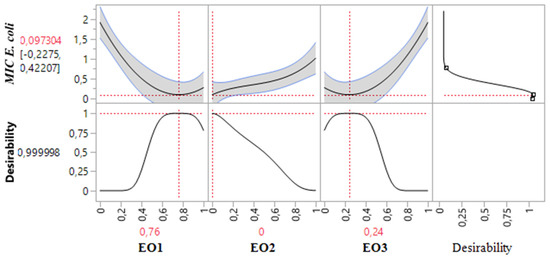 Desirability profile illustrating the precise proportions, leading to the optimum value for MICE.coli. EO1: T. satureioides EO; EO2: L. angustifolia EO; EO3: O. majorana EO.
