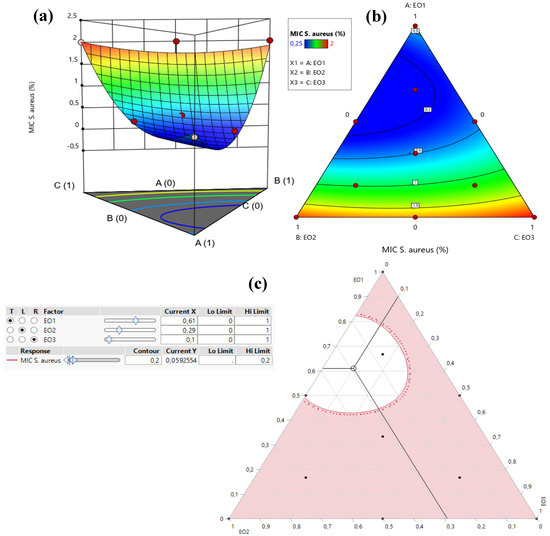 The optimal MIC value for S. aureus was determined through an analysis of 2D and 3D mixture plots focused on the identified compromise region. Panels (a,b) illustrate 3D mixture plots, highlighting the desired compromise zone within the ternary mixing area of T. satureioides, L. angustifolia, and O. majorana. Panel (c) presents a 2D mixture plot, which identifies the optimal compromise region leading to the desired MIC value of 0.058% against S. aureus. This result was achieved by using a ternary mixture composed of 61% T. satureioides, 29% L. angustifolia, and 10% O. majorana essential oils. EO1: T. satureioides EO; EO2: L. angustifolia EO; EO3: O. majorana EO.