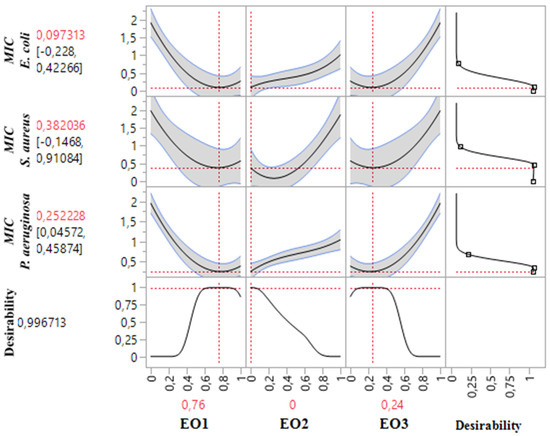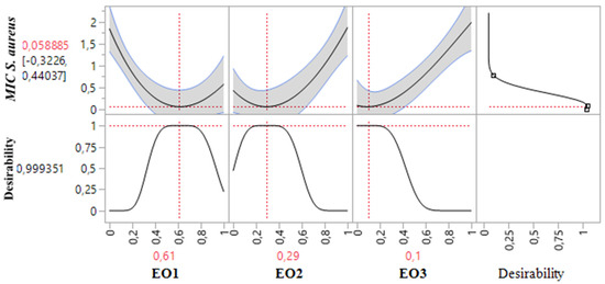 Desirability profile illustrating the precise proportions leading to the optimum value for MICS.aureus. EO1: T. satureioides EO; EO2: L. angustifolia EO; EO3: O. majorana EO.